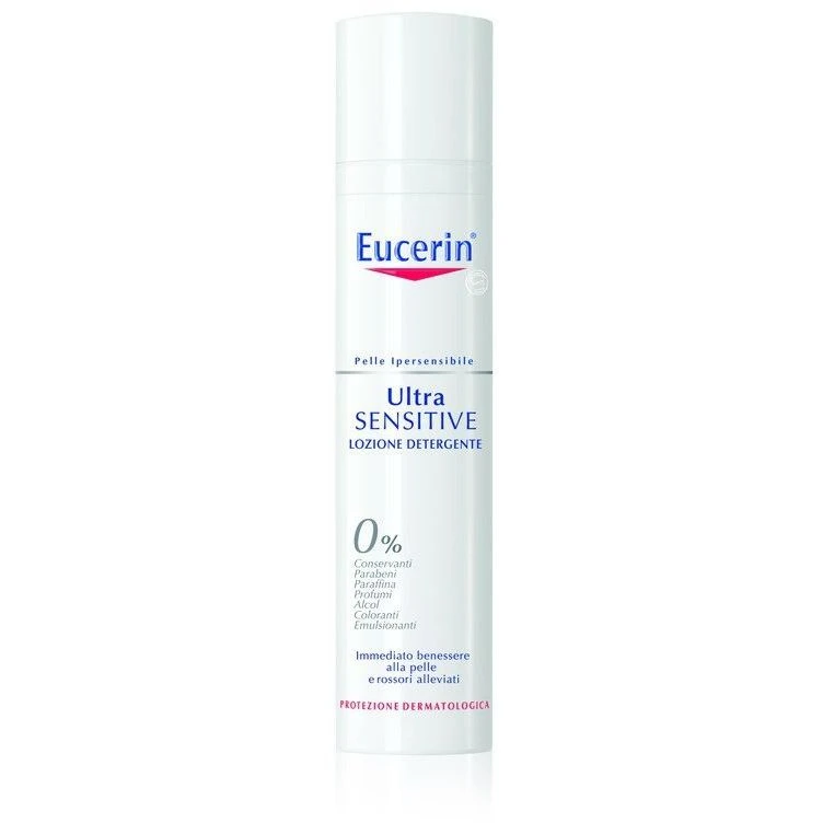 Eucerin Ultra Sensitive Lozione Detergente lascia la pelle ipersensibile (compresa quella tendente al rossore/alla Rosacea/alla Couperose) perfettamente detersa mentre la sua formula ‘pura’ contiene solo un numero limitato di ingredienti che riducono le intolleranze e le reazioni allergiche. La Lozione Detergente UltraSENSITIVE non contiene tensioattivi, ed è molto delicata sulla pelle, anche se è sufficientemente efficace da rimuovere il trucco.