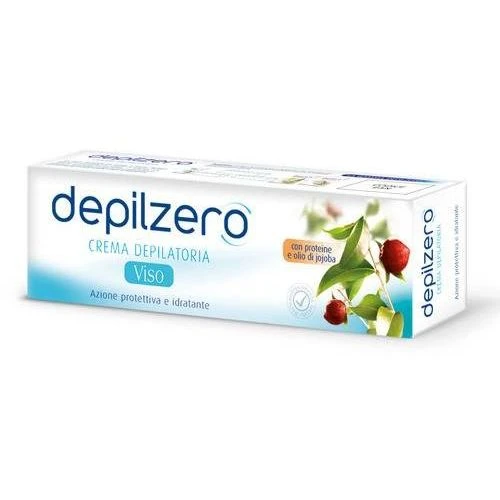 depilzero CREMA DEPILATORIA – VISO :Formulazione ultradolce, per l’eliminazione dei peli superflui del viso. La sua formula, piacevolmente profumata, è arricchita con proteine e Olio di Jojoba, noti per la loro azione protettiva ed idratante per la pelle durante e dopo la depilazione. Modalità d’uso : Stendere il prodotto con l’apposita spatolina in modo da coprire completamente la superficie da depilare. Attendere il tempo stabilito nel test preliminare senza superare il limite massimo di 8 minuti. Assicurarsi poi, con l’aiuto della spatolina, che i peli siano caduti e non cercare di accelerare la depilazione con sfregamenti. Infine, risciacquare la zona depilata con una spugna imbevuta d’acqua.