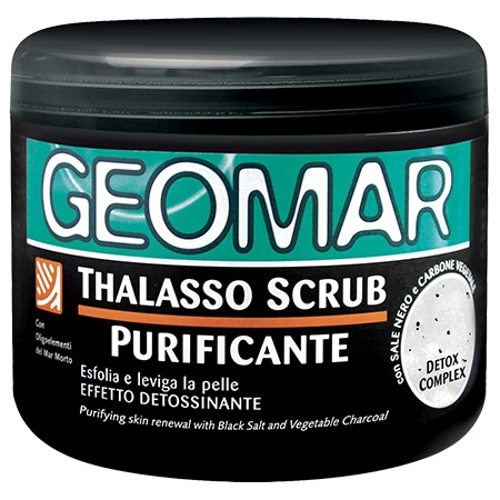 GEOMAR THALASSO SCRUB PURIFICANTE: Esfolia e leviga la pelle – Effetto detossinante. Grazie alla miscela di Sale Marino, Sale nero e sabbia vulcanica esfolia la pelle rimuovendo efficacemente dalla cute cellule morte e impurità. Il Detox Complex (Sale nero + Carbone vegetale) aiuta la pelle a purificarsi e detossinarsi, metre l’olio di Moringa nutre l’epidermide. Risultati: la pelle appare subito più levigata e morbida. L’uso continuativo, grazie anche all’azione sinergica del massagio con gli elementi esfolianti, permette di levigare le imperfezioni cutanee e di svolgere un’azione detossinante, grazie alla rimozione delle impurità