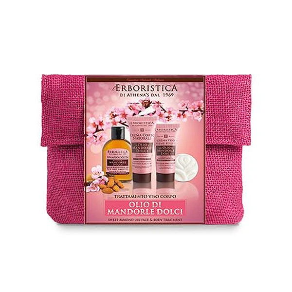 La Pochette Weekend beauty: il comfort di un trattamento viso e corpo dell’Erboristica a portata di mano. Quattro prodotti a base di Olio di Mandorle in formato mini. Questa pochette di juta contiene 4 prodotti L’Erboristica a base di Olio di Mandorle Dolci in formati ridotti. Comoda, pratica e di piccolo ingombro, consente a chi viaggia, a chi fa sport o a chi ha una vita movimentata e non sempre riesce a tornare a casa dopo il lavoro per prepararsi ad una serata fuori, di non rinunciare al comfort di un trattamento di bellezza completo. La pochette contiene: Shampoo doccia 50ml Crema corpo 35ml Crema viso prime rughe 20ml Sapone vegetale 30gr La bellezza è a portata di mano!