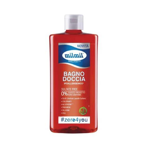 Si tratta di una gamma la cui caratteristica principale è la formulazione con meno prodotti chimici e più rispettosa dell’ambiente. MILMIL 0% contiene solo quegli ingredienti necessari per una pelle sana e vellutata. In testa alla lista zero% SULFATE FREE perché i prodotti sono totalmente privi di solfati, cioè non sono solo 0% SLES, (inci Sodium Laureth Sulfate), ma anche 0% MAGNESIUM LAURETH SULFATE e 0% AMMONIUM LAURYL SULFATE. 0% COLORANTI 0% ALCOOL 0% PEG 0% PARABENI 0% ALLERGENI* 0% FTALATI * Senza allergeni derivanti da profumo secondo Reg. CE 1223/2009 Allegato III.