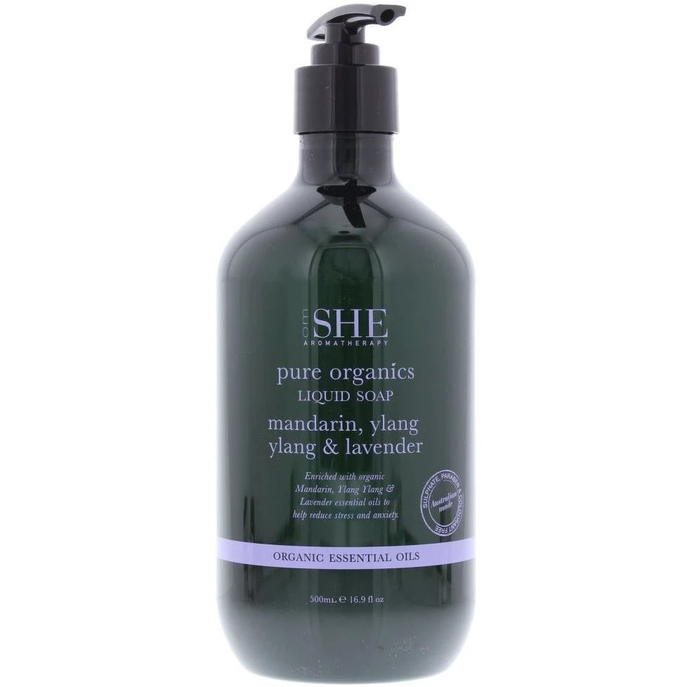 Om She Aromatherapy Sapone Liquido Mandarino, Ylang Ylang & Lavanda. Arricchito con oli biologici di rosa mosqueta, aloe vera, camomilla e calendula per detergere delicatamente. Privo di parabeni, solfati o coloranti.