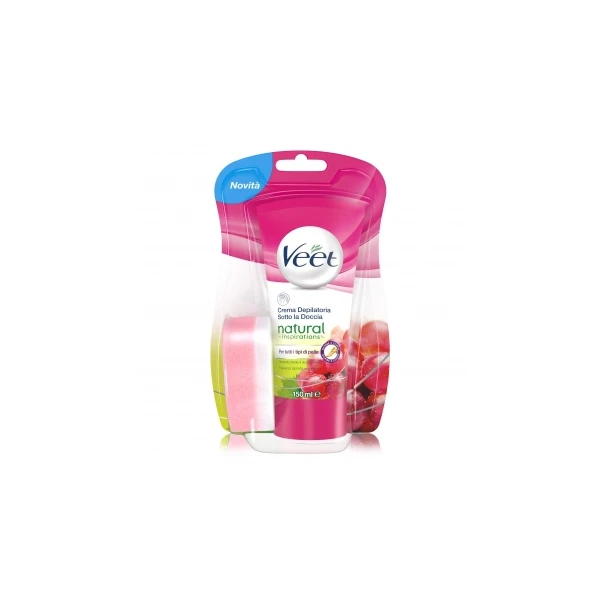 Prova il tocco della natura con la nuova crema depilatoria Veet Natural Inspirations. Sotto la Doccia. Appositamente formulata con estratto naturale di olio di semi d’uva noto per le sue proprietà ammorbidenti, presenta una fresca fragranza ispirata alla natura. La tua pelle risulterà più idratata e sensibilmente più liscia per più tempo rispetto alla semplice rasatura. Per tutti i tipi di pelle, (incluse le pelli sensibili) Veet Sotto la Doccia è stata realizzata per adattarsi a ritmi frenetici della vita quotidiana: grazie all’esclusiva combinazione di ingredienti resistenti all’acqua, agisce sotto la doccia senza rubare tempo prezioso alla giornata. Preparazione e uso Pelle bella e liscia in sole 5 mosse: Prima dell’utilizzo, leggere attentamente le precauzioni d’uso sulla confezione. 1 Prima della doccia, applicare la crema sulla pelle asciutta in modo uniforme utilizzando il lato morbido e colorato della spugna. Non strofinare. Assicurarsi di coprire interamente l’area da depilare. Lavare le mani per eliminare eventuali residui di crema. 2 Dopo l’applicazione attendere almeno 2 minuti prima di entrare in doccia. 3 Proseguire con la doccia. Per i primi 3 minuti, evitare di esporre la crema al getto diretto dell’acqua, lasciando il tempo di agire. In questa fase, è normale che parte della crema scivoli via. 4 Dopo aver lasciato agire la crema per 5 minuti, rimuovere delicatamente una piccola quantità con il lato bianco della spugna e verificare lo stato della depilazione. Se i peli vengono via facilmente, rimuovere il resto della crema passando la spugna con movimenti circolari. Per i peli più resistenti, lasciare agire la crema per altri 5 minuti, senza comunque superare i 10 minuti di tempo di applicazione. Per le zone più sensibili, rimuovere la crema con il lato morbido e colorato della spugna. 5 Risciacquare abbondantemente la pelle con acqua per eliminare i residui di crema, quindi asciugare. Risciacquare la spugna e conservare il tubetto ben chiuso per mantenere intatta l’efficacia.